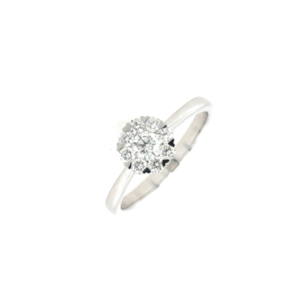Deze ring heeft centraal één briljant met daarrond 8 kleinere briljanten.