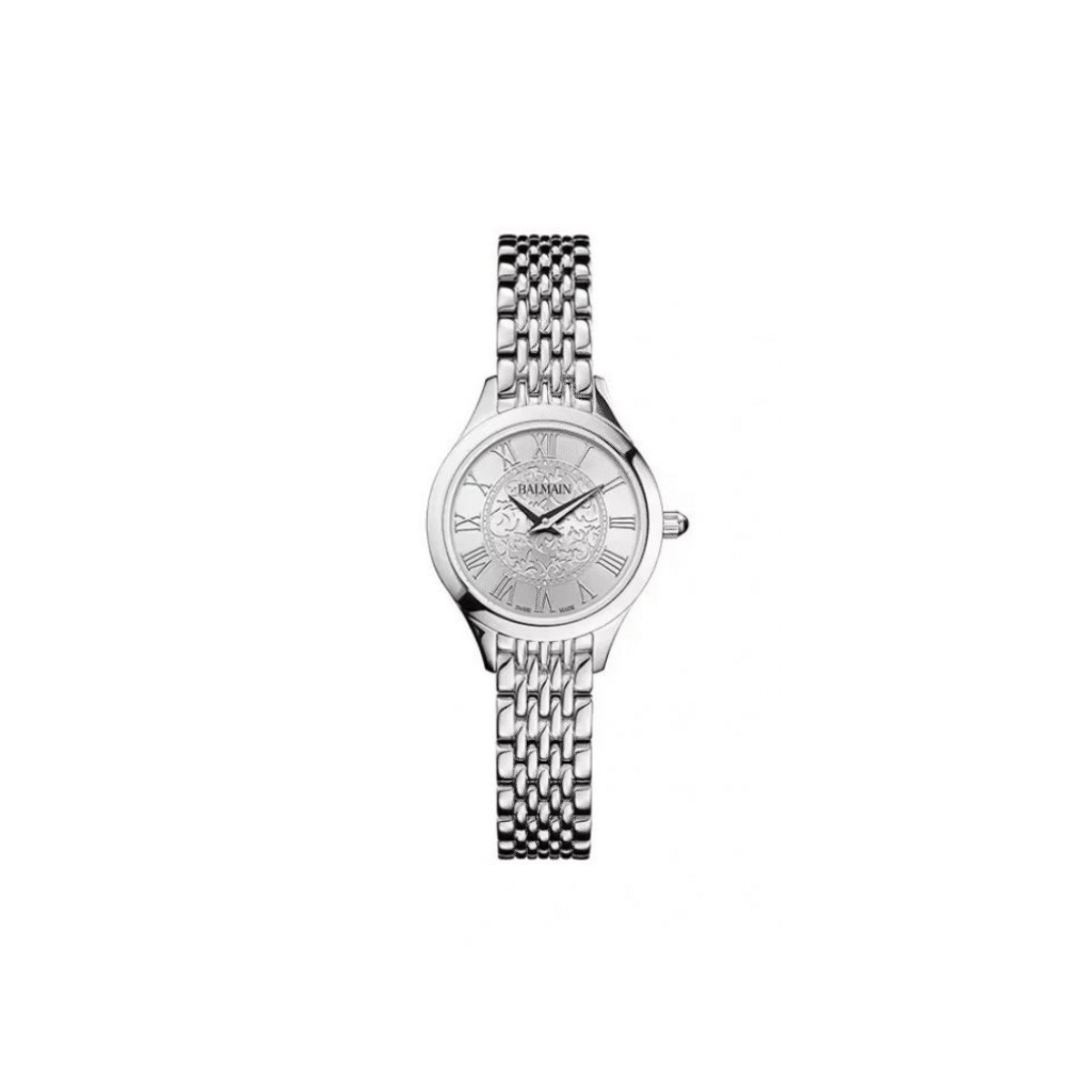 Zilverkleurige wijzerplaat met het typische Balmain arabesk motief.