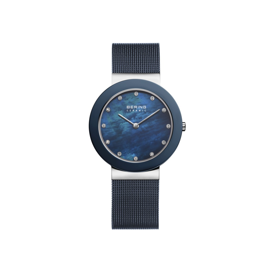 Blauwe parelmoer wijzerplaat met zirconia als indexen.