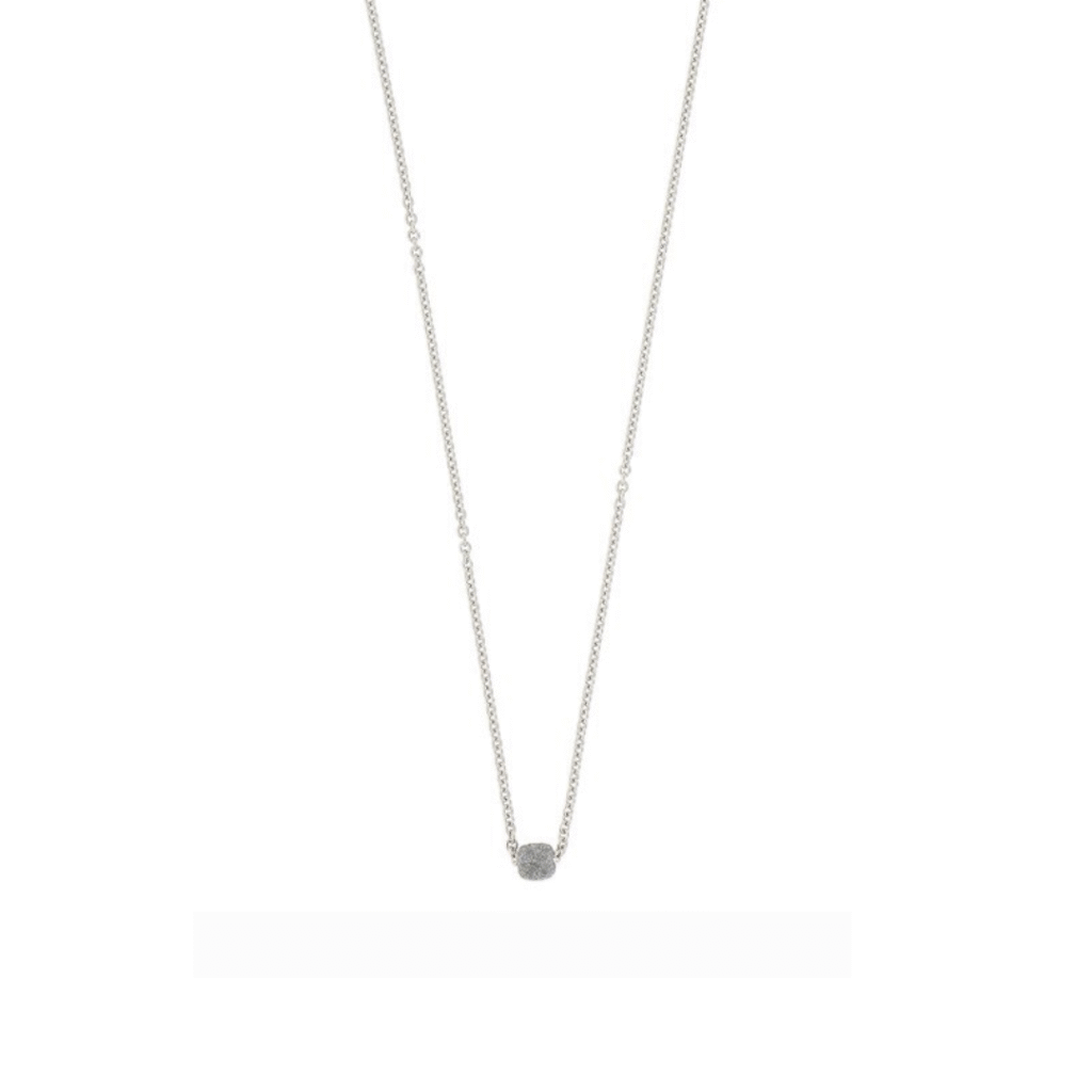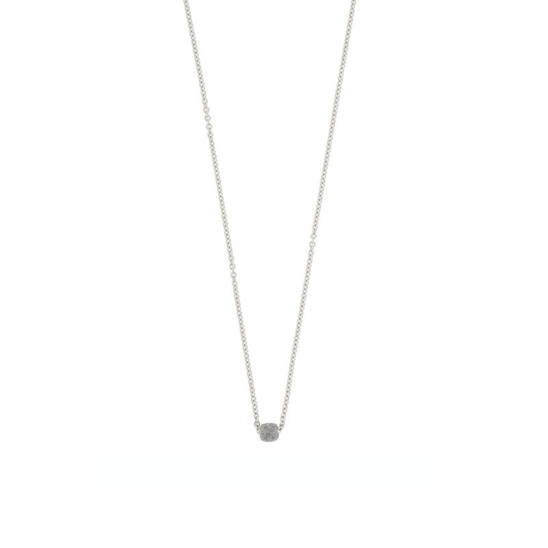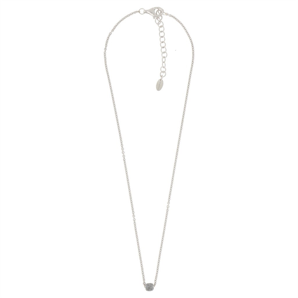 In de ketting hangt een fijn motief dat gezet is met grijze gebroken email.