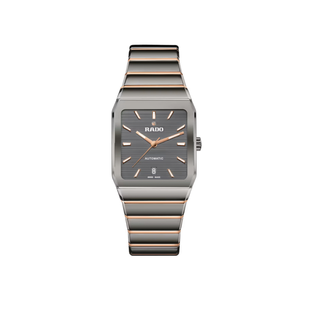 De band bestaat uit grijze plasma high-tech ceramic en rosékleurig staal.