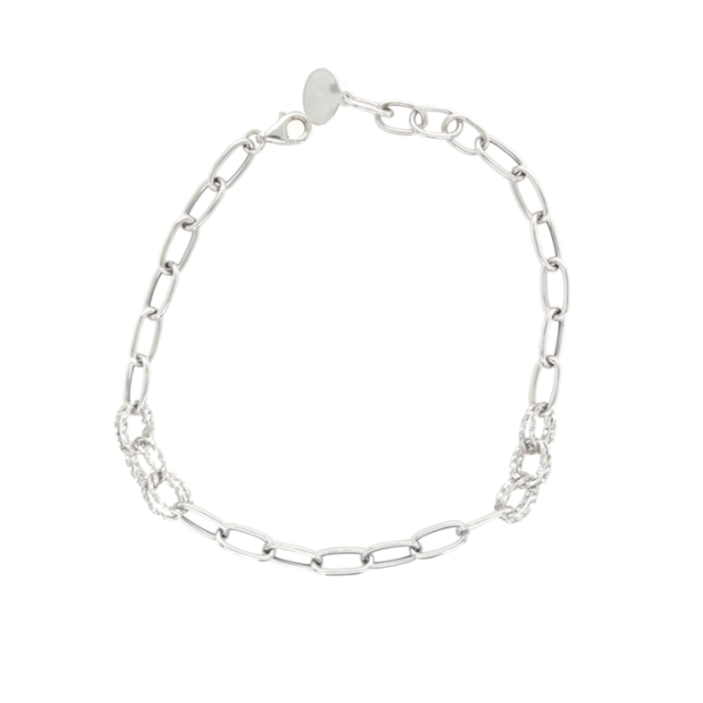 In de armband zijn er op twee plaatsen drie dubbele schakels met een gefacetteerd effect.
