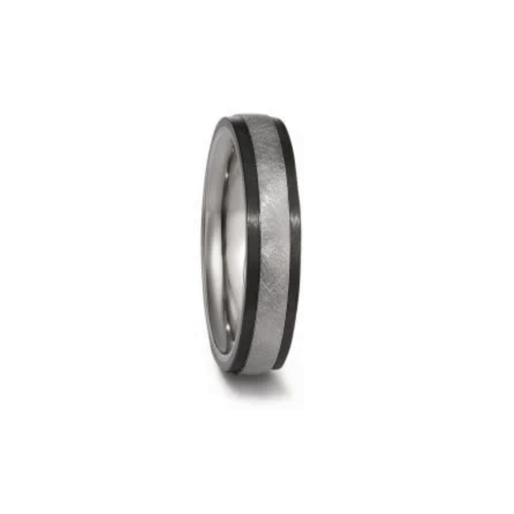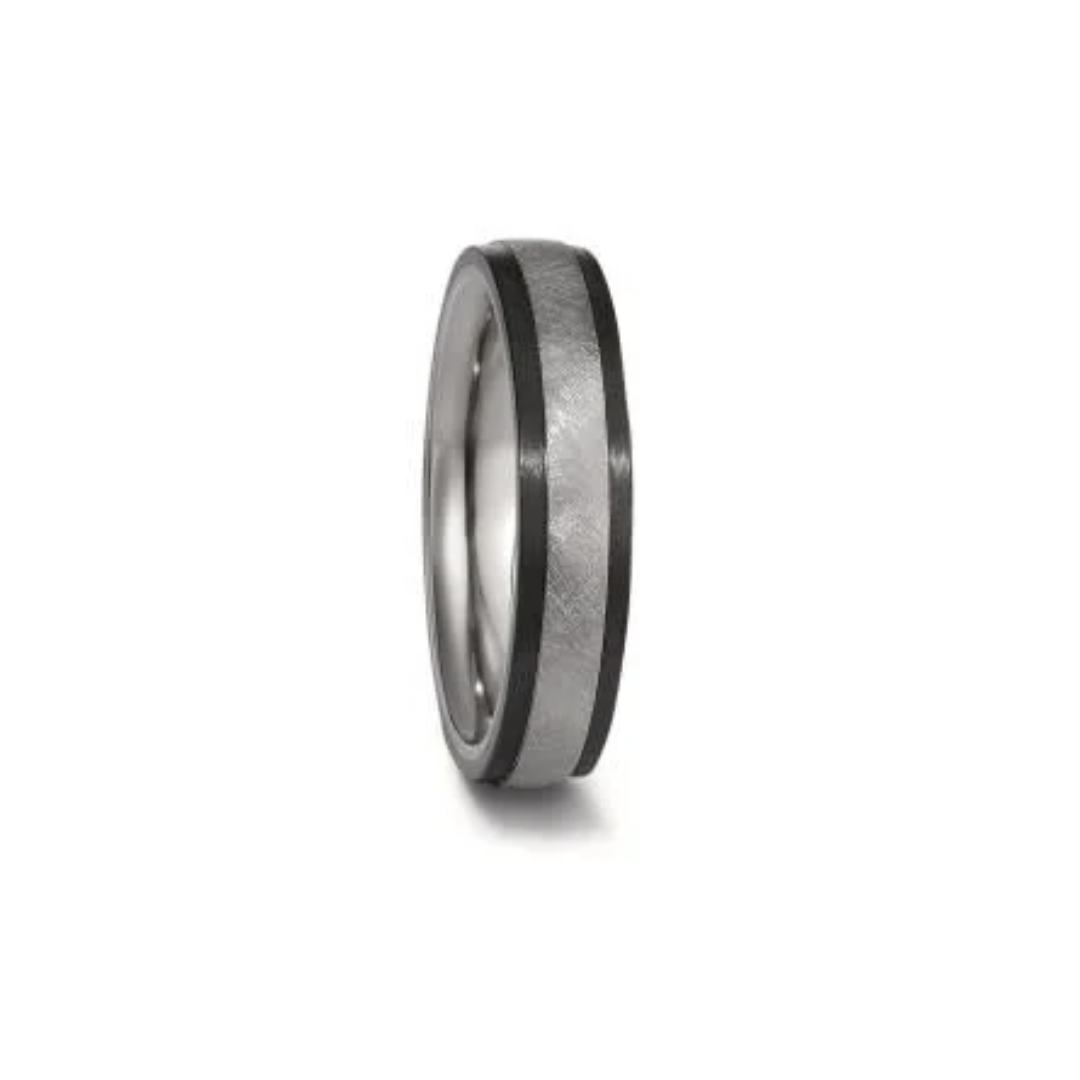Eigentijdse ring vervaardigd uit titanium en carbon.