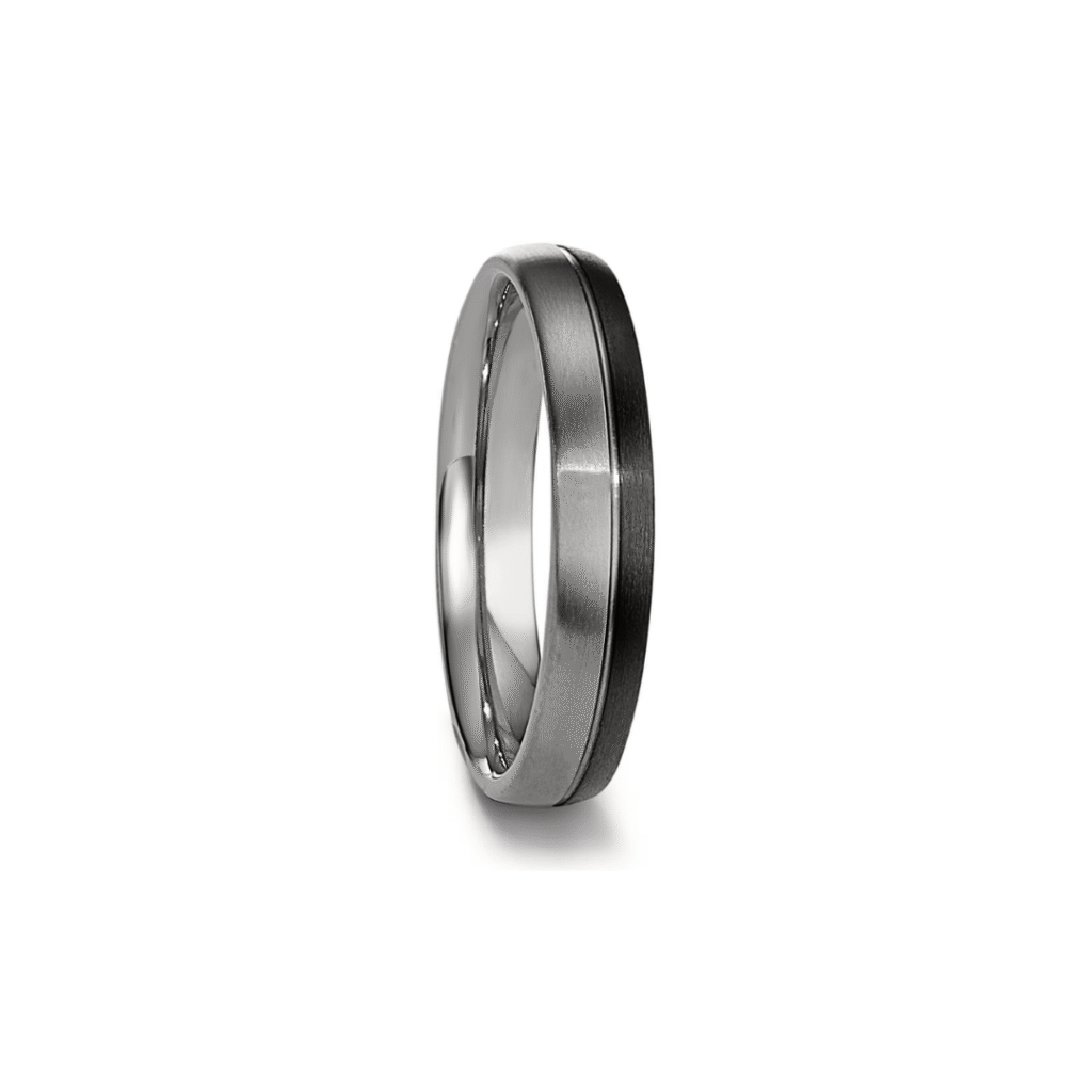 Eigentijdse ring vervaardigd uit titanium en carbon.