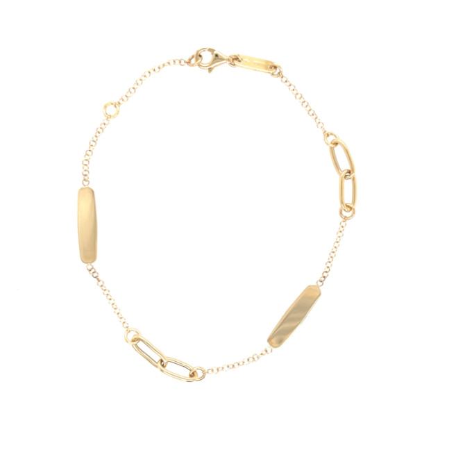 Fijne armband waartussen 2 ovale plaatjes en 4 open schakels verwerkt zijn.