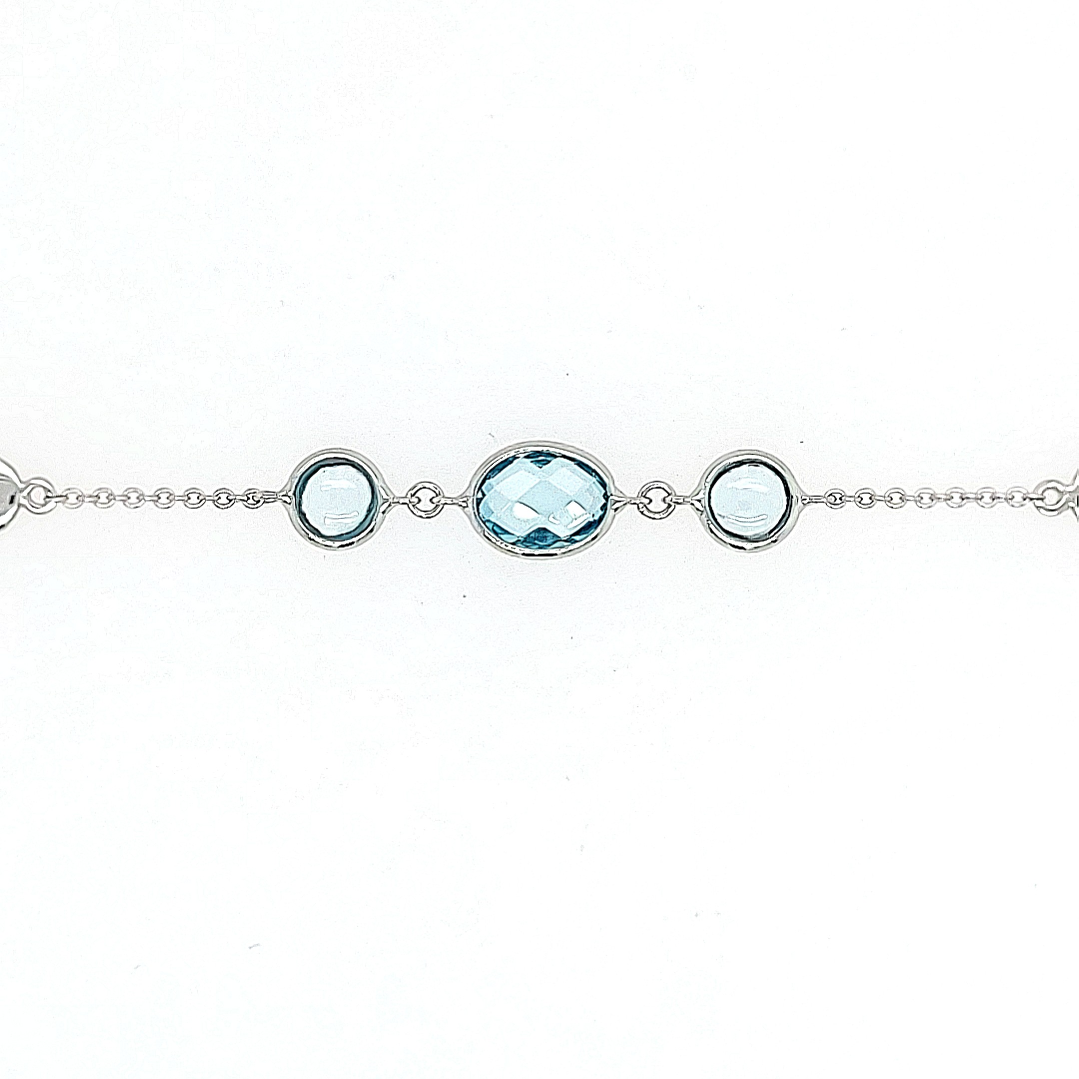 In de armband zitten meerdere motieven met blauwe topaas.