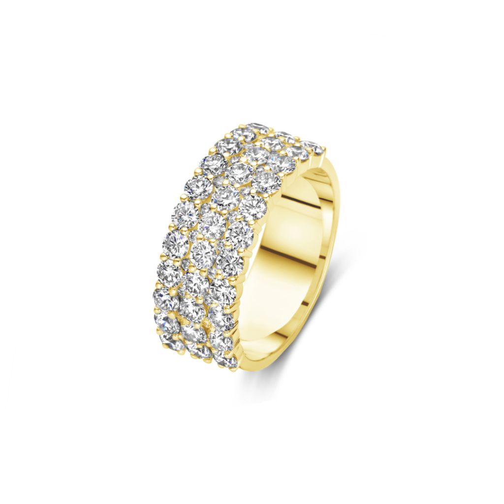 Deze ring is afgewerkt met 53 briljanten die in drie evenwijdige rijen lopen.