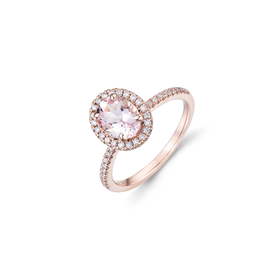 De kop van de ring is ovaal met in het midden een roze morganiet gezet in vier griffen.